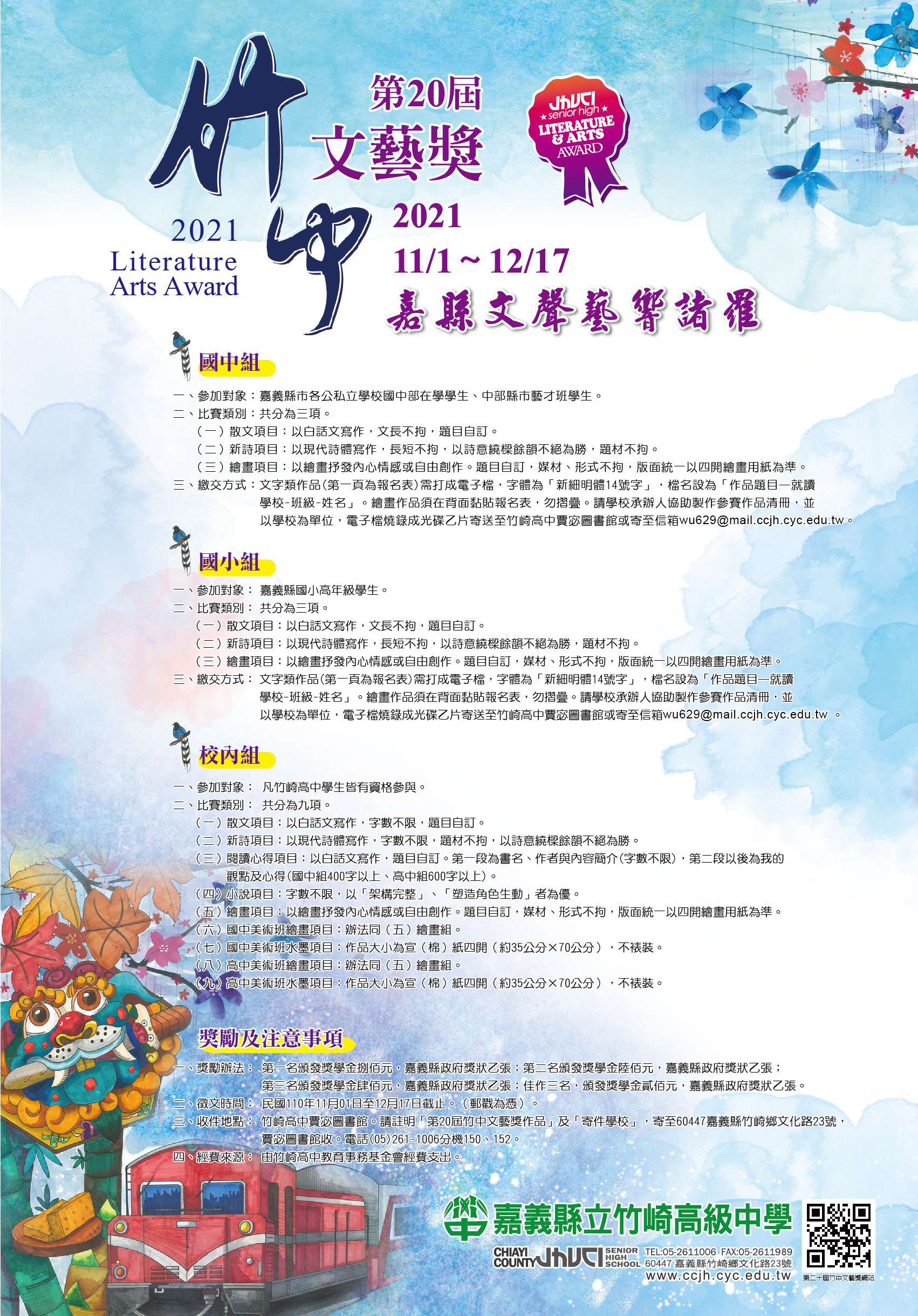 嘉義縣立竹崎高級中學 函本校辦理「嘉縣文聲藝響諸羅-第二十屆竹中文藝獎」活動,敬邀貴校師生共襄盛舉,請查照。