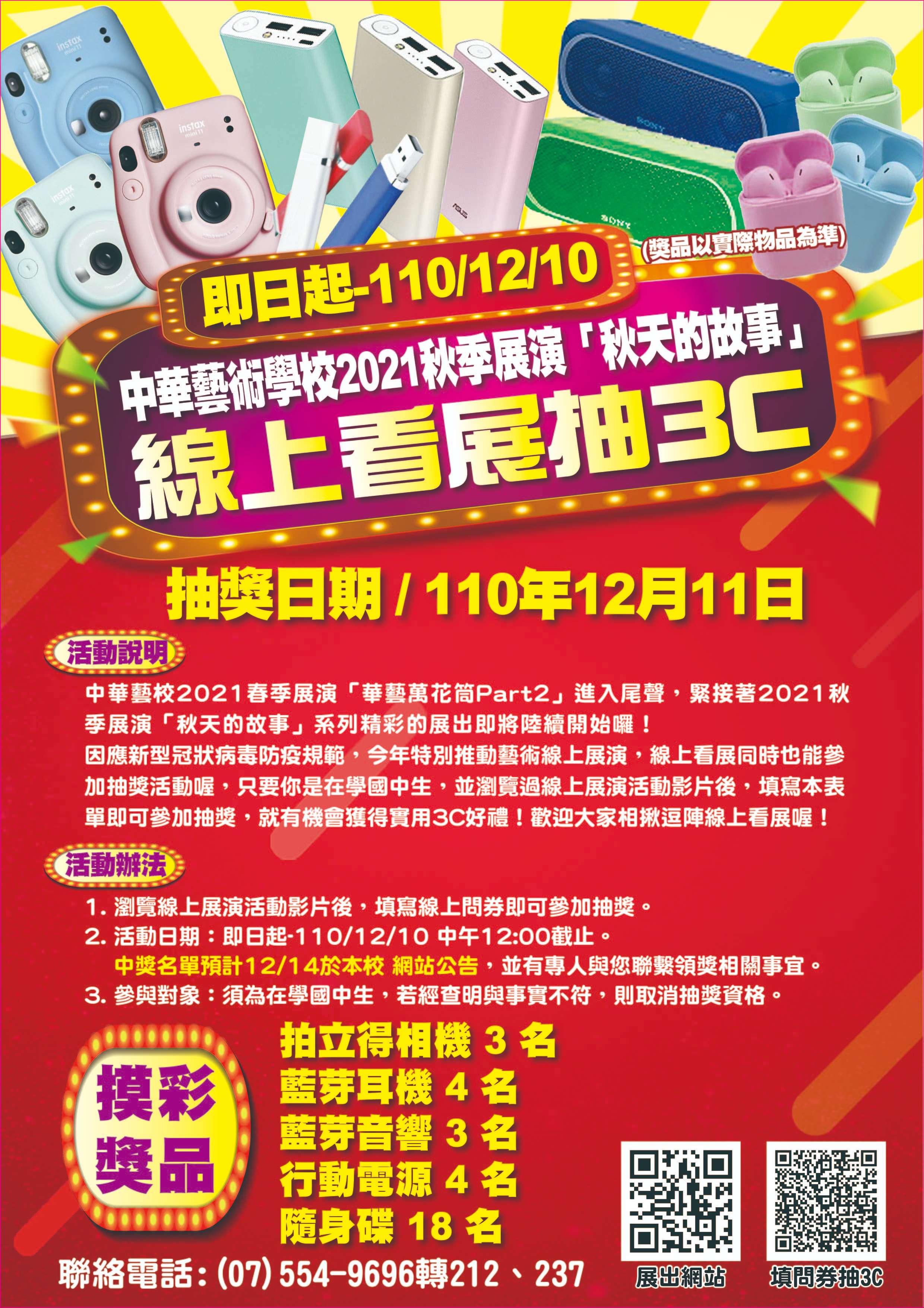 一、因應新型冠狀病毒防疫規範,中華藝校今年特別推動藝術線上展演,瀏覽線上展演活動影片後填寫線上問卷即可參加抽獎活動。