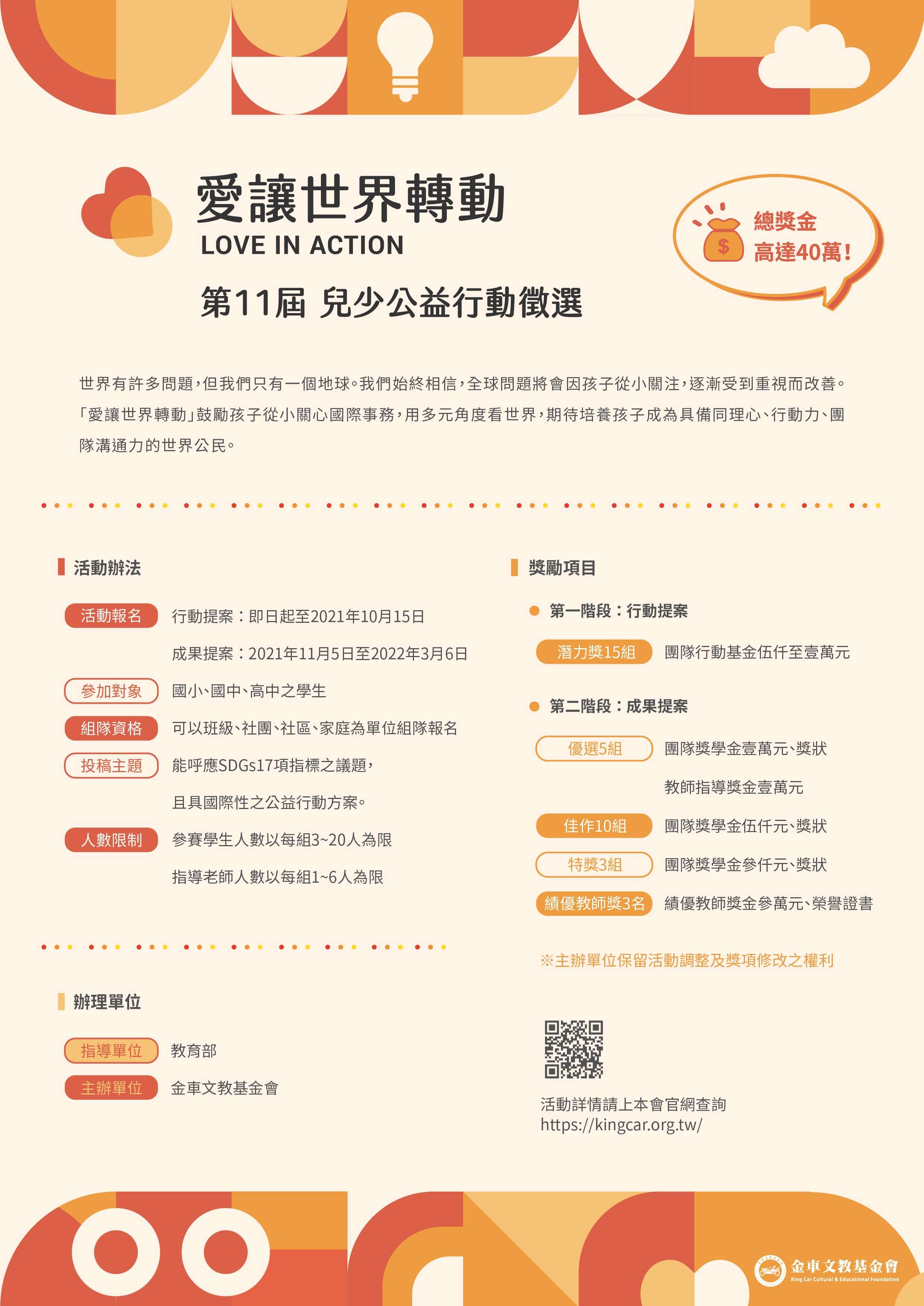 一、本會自2011年開始舉辦「愛讓世界轉動 兒少公益行動」徵選,多年來全台各地累積超過萬名師生參與,以STAGE行動步驟讓孩子走進世界舞台,學習發現問題、付諸行動、發揮愛心並能收穫成長。