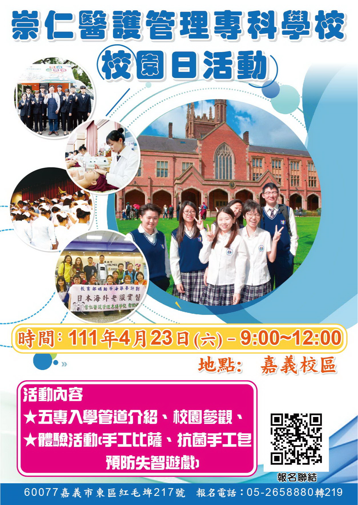 (二)活動內容:五專入學管道說明、科系介紹及各科體驗課程。