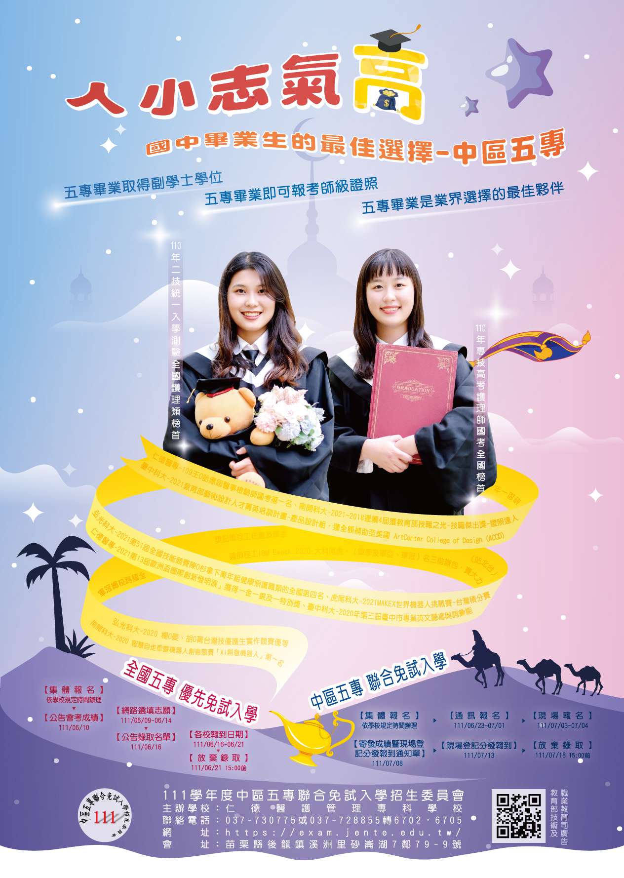 二、該會統籌辦理111學年度中區五專五校27科系免試入學招生作業,核定招生名額共計2,216人。中區五專提供適性多元的科系,除時下最夯科系外,另有新興行業特殊之科系,如: 人工智慧暨醫療應用科、精密機械工程科、創意商品設計菁英班、生命關懷事業科及自動化工程科等,相關招生資訊已公告於該會網站(https://exam.jente.edu.tw/)。
