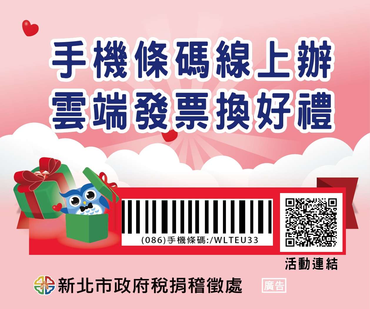 三、跑馬燈刊登文字如下:「新北市政府稅捐稽徵處官網提供手機條碼線上辦及雲端發票換好禮服務,歡迎大家一起來申請載具存發票,做捐贈拿好禮」。