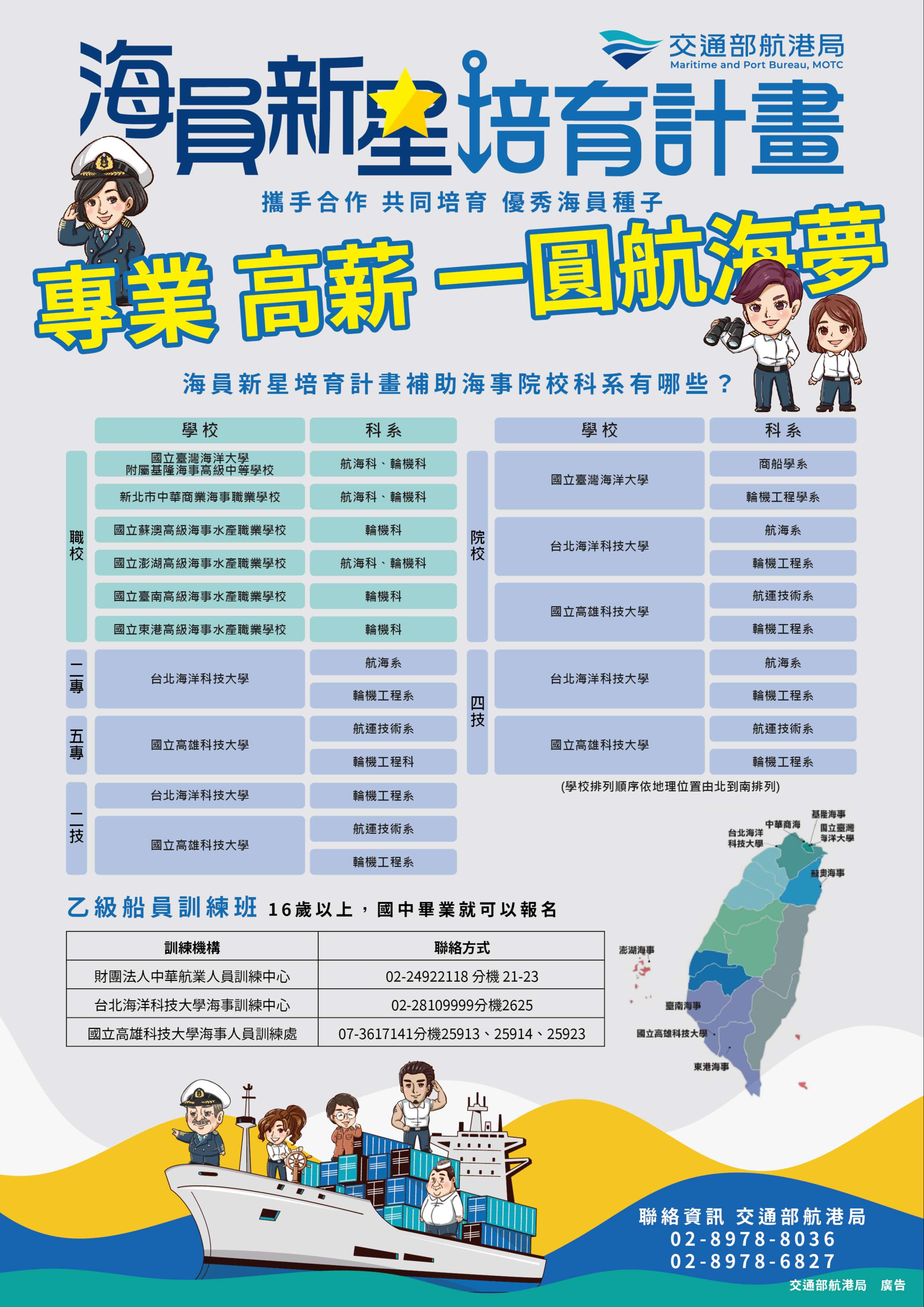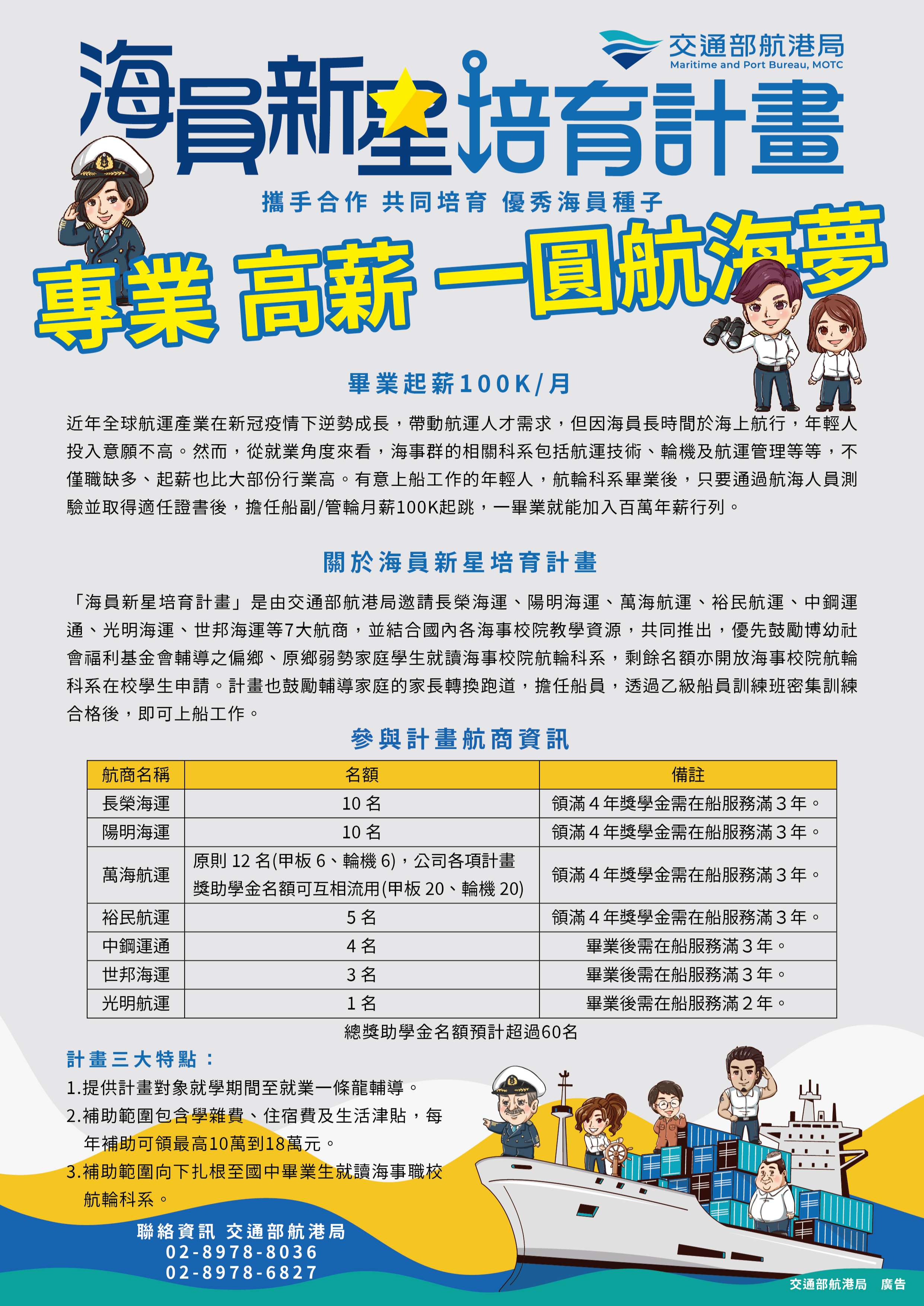 二、為鼓勵青年學子就讀本國海事院校並提供多元就業選擇,該局辦理「海員新星培育計畫」,提供參與之學生獎助學金、住宿及生活津貼相關補助,敬協助轉知計畫相關資訊及宣傳影片予貴校師生,俾利學生踴躍參與。