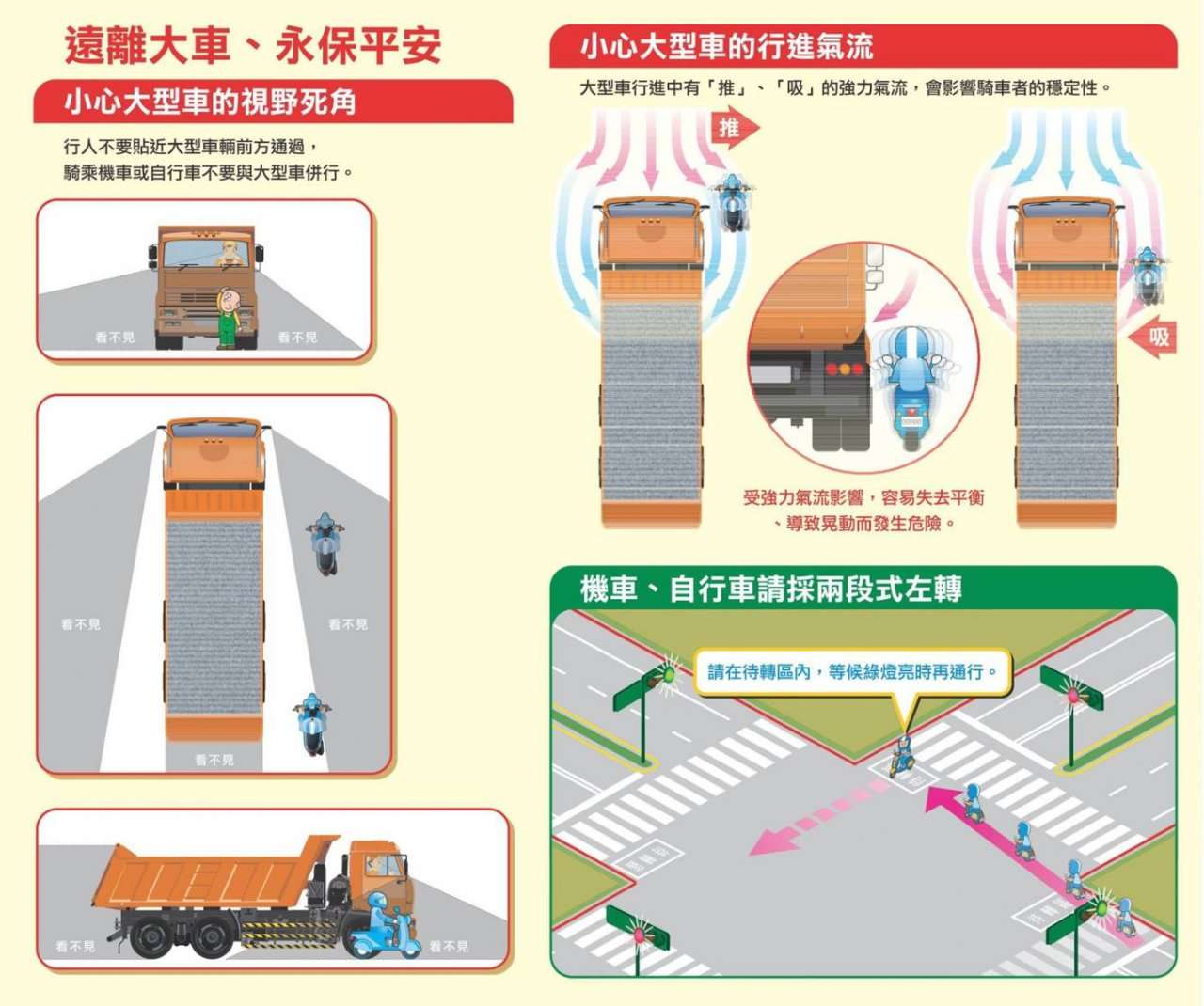 四、隨文檢附大客車視野死角、大客車行進週遭安全注意圖示及機車、自行車兩段式左轉及路口慢看停示意圖電子檔供參,請逕行下載轉載並廣為宣導。
