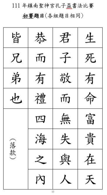 三、書法比賽需自行寄送初賽作品至「鎮南聖神宮」,初賽題目如附件。