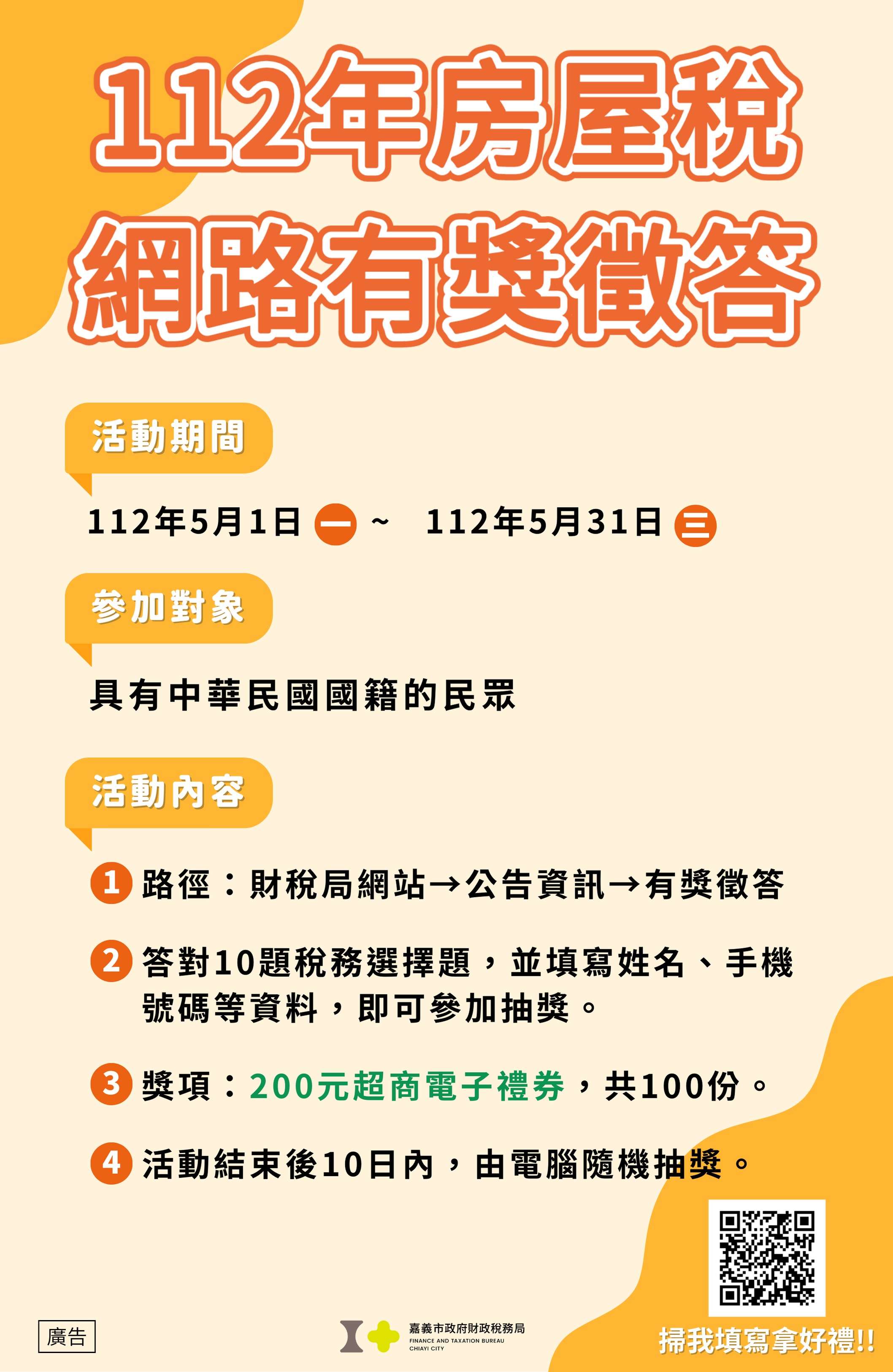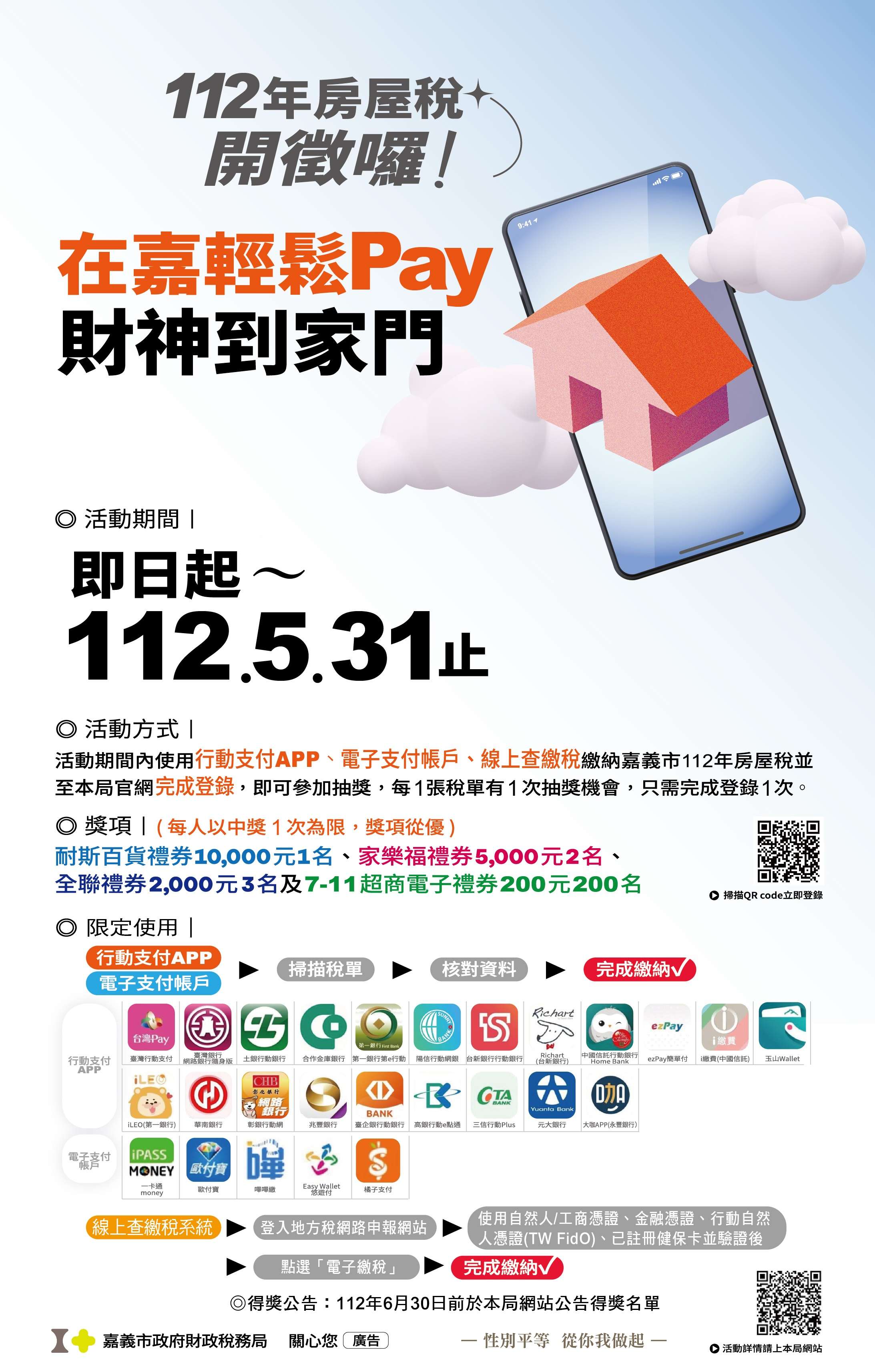 (三)「在嘉輕鬆Pay 財神到家門」,5月31日前以行動支付APP、電子支付帳戶或線上查繳稅繳納房屋稅並至市府財稅局網站完成登錄,即可參加抽獎。