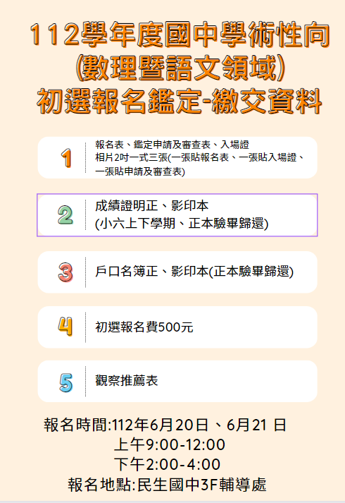 注意: 欲報名國中資優鑑定管道二書面審查之學生及其家長,請務必詳閱「本市112學年度國民中學學術性向(數理暨語文領域)資賦優異學生鑑定實施計畫」附件三,有關書面審查原則之說明。尤其是所附文件為團體獎項者,需具體列出申請者所負責之內容與貢獻,並經共同作者簽名認可,鑑輔會方能據此進行審議。