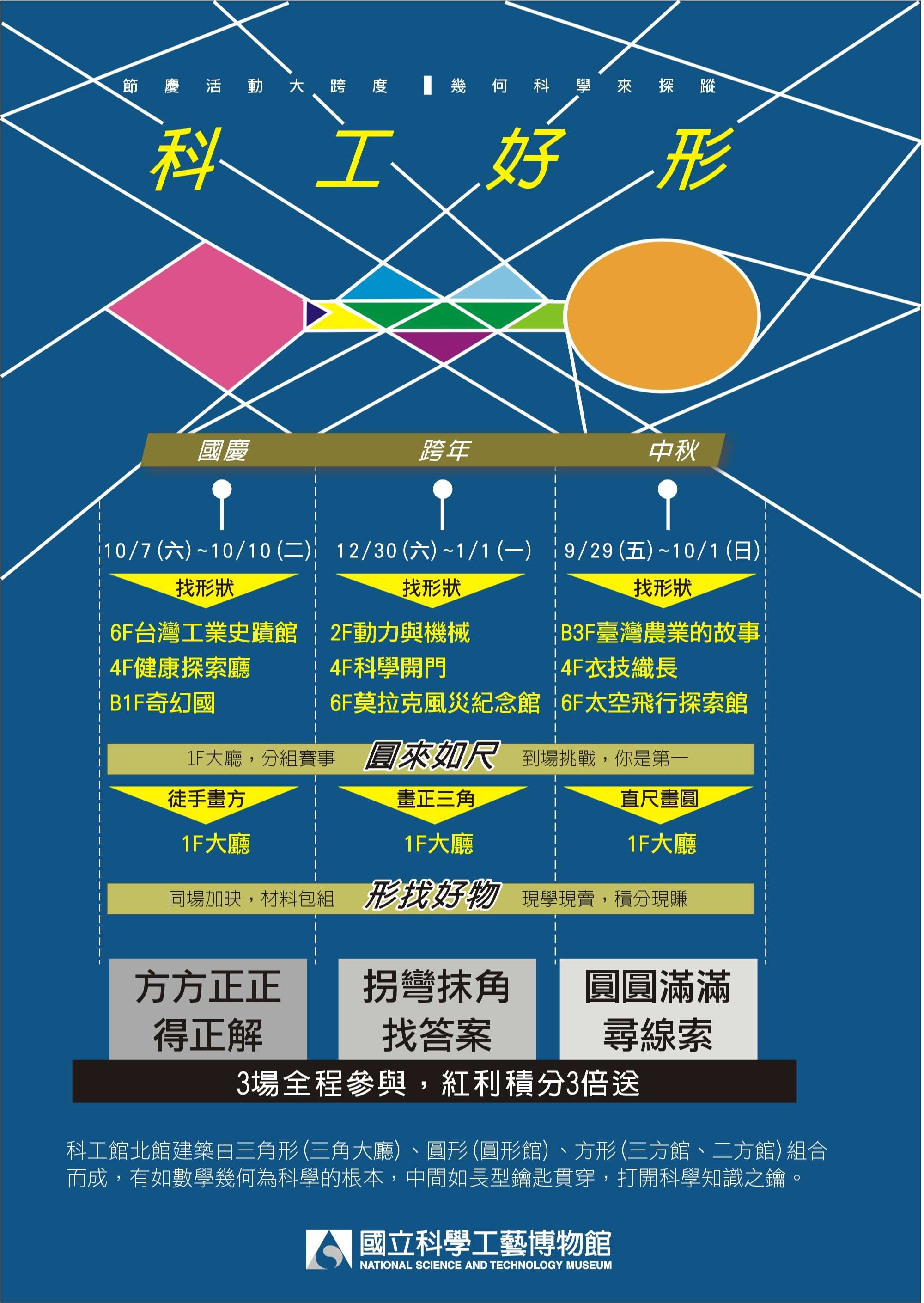 一、為鼓勵各級學校師生利用中秋、國慶及跨年3大連續假期參訪博物館、增進節慶氣氛,本館規劃「科工好形」節慶闖關活動,依其意象(月亮、國旗、跨距),巧妙結合本館建築量體的三個組成元素(圓形、方形、長方形),歡迎親子掃碼逛展廳,積分得紅利。