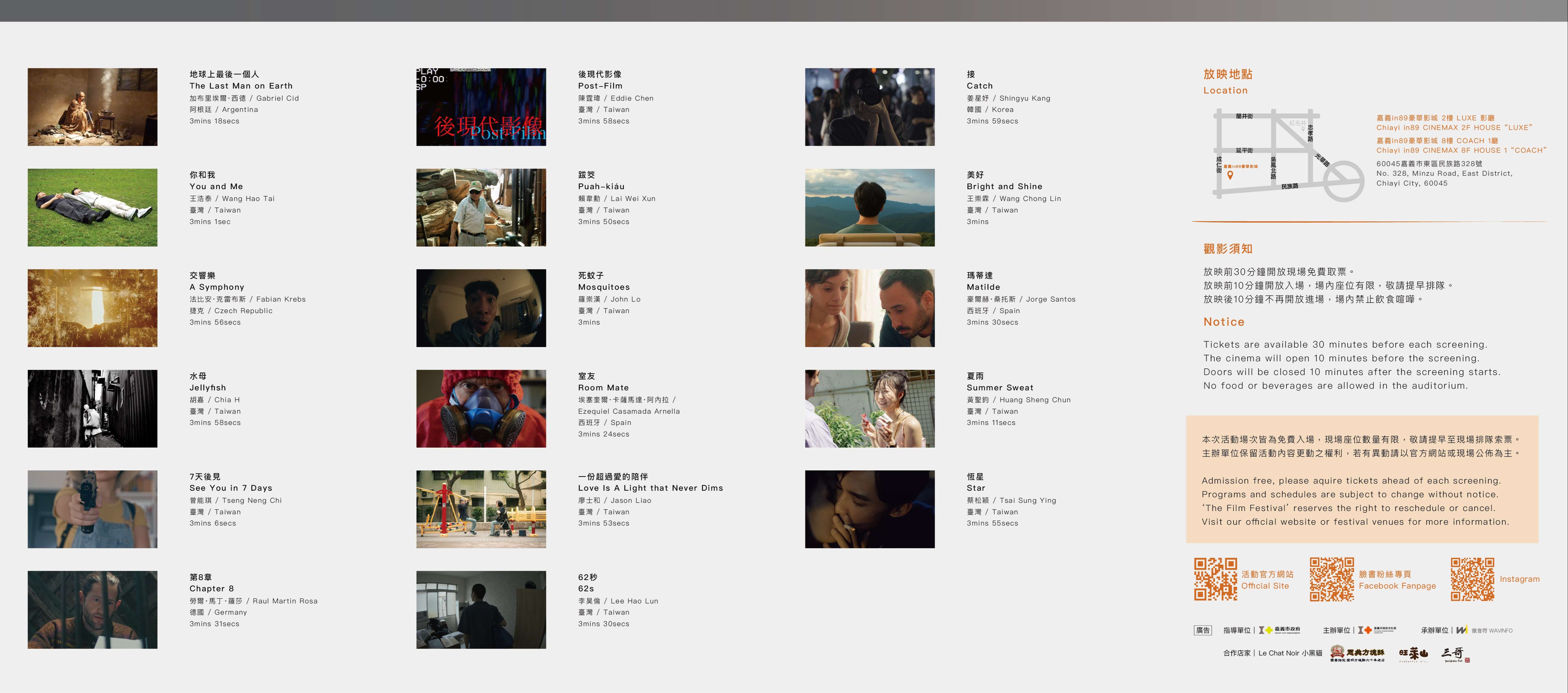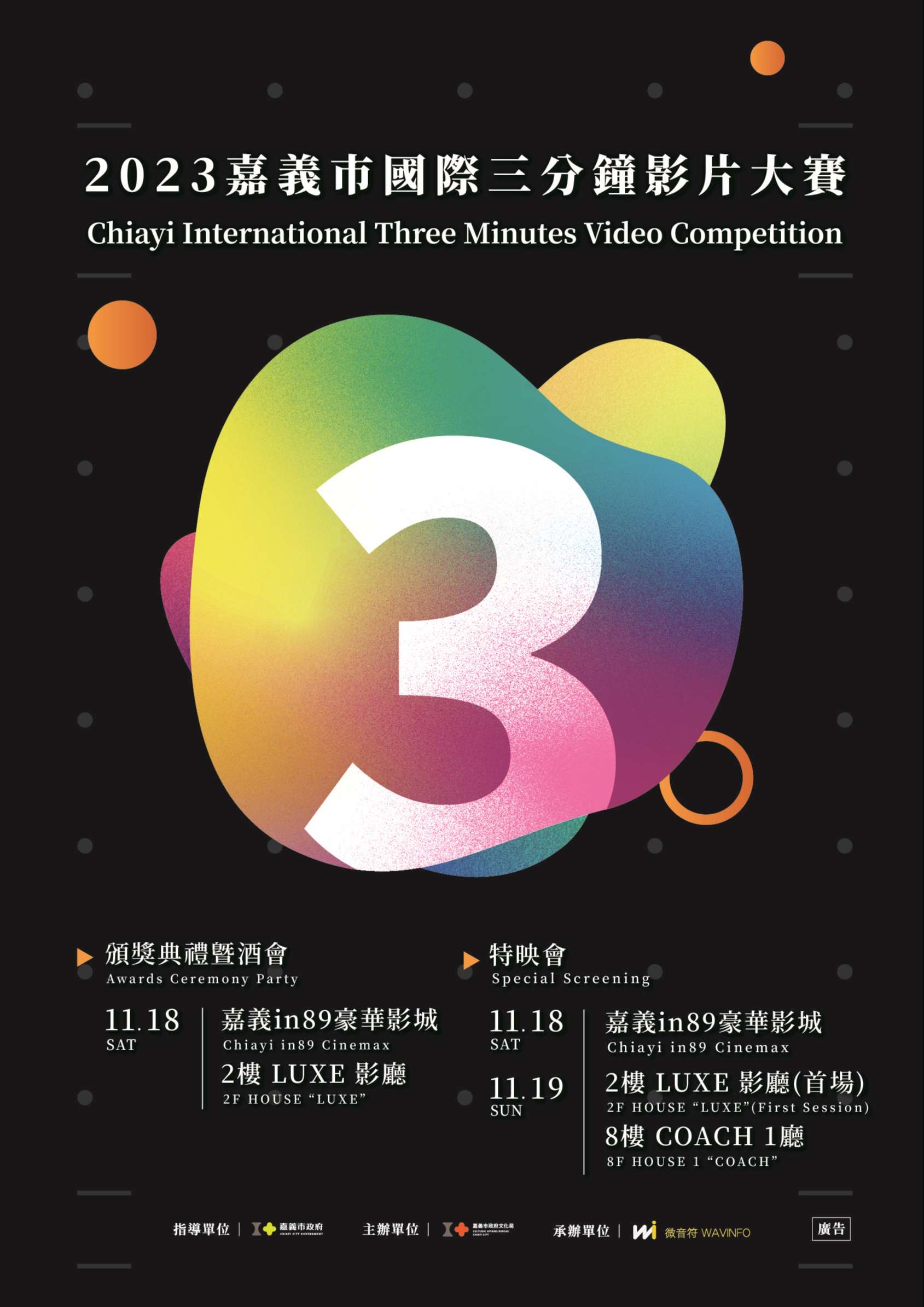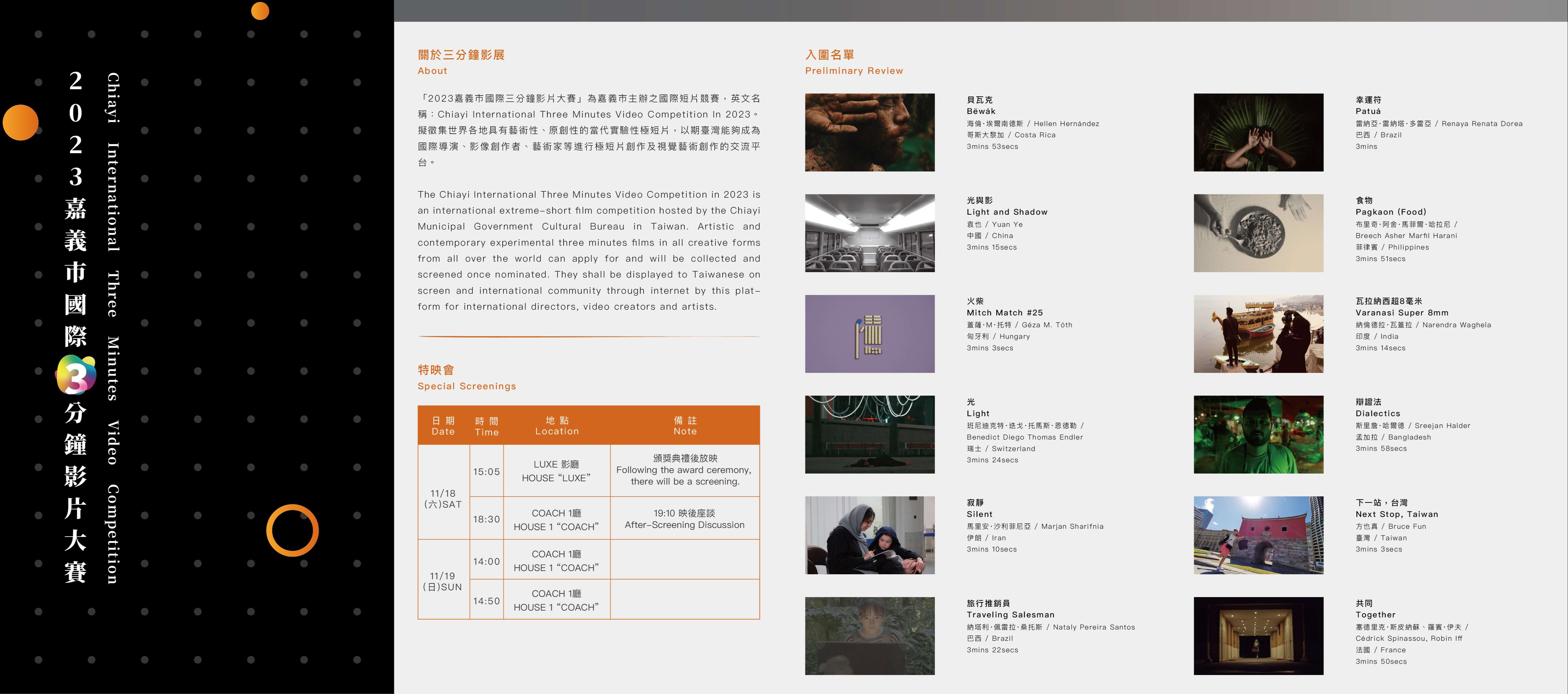 (1)112年11月18日(星期六)15時05分(首場接續頒獎典禮後放映)、18時30分各一場。