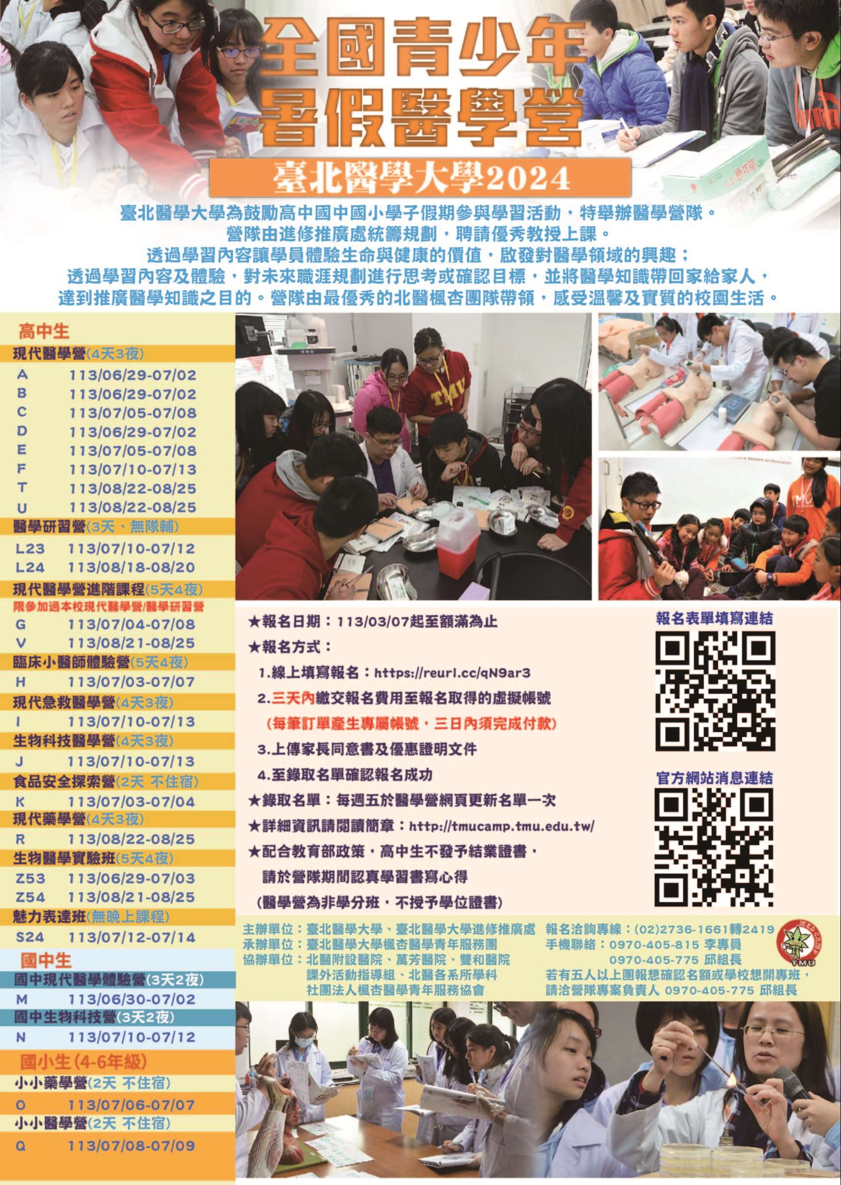 二、營隊資訊:2024暑期醫學營擬訂於民國113年6月29日至8月25日辦理。網址 http://tmucamp.tmu.edu.tw/