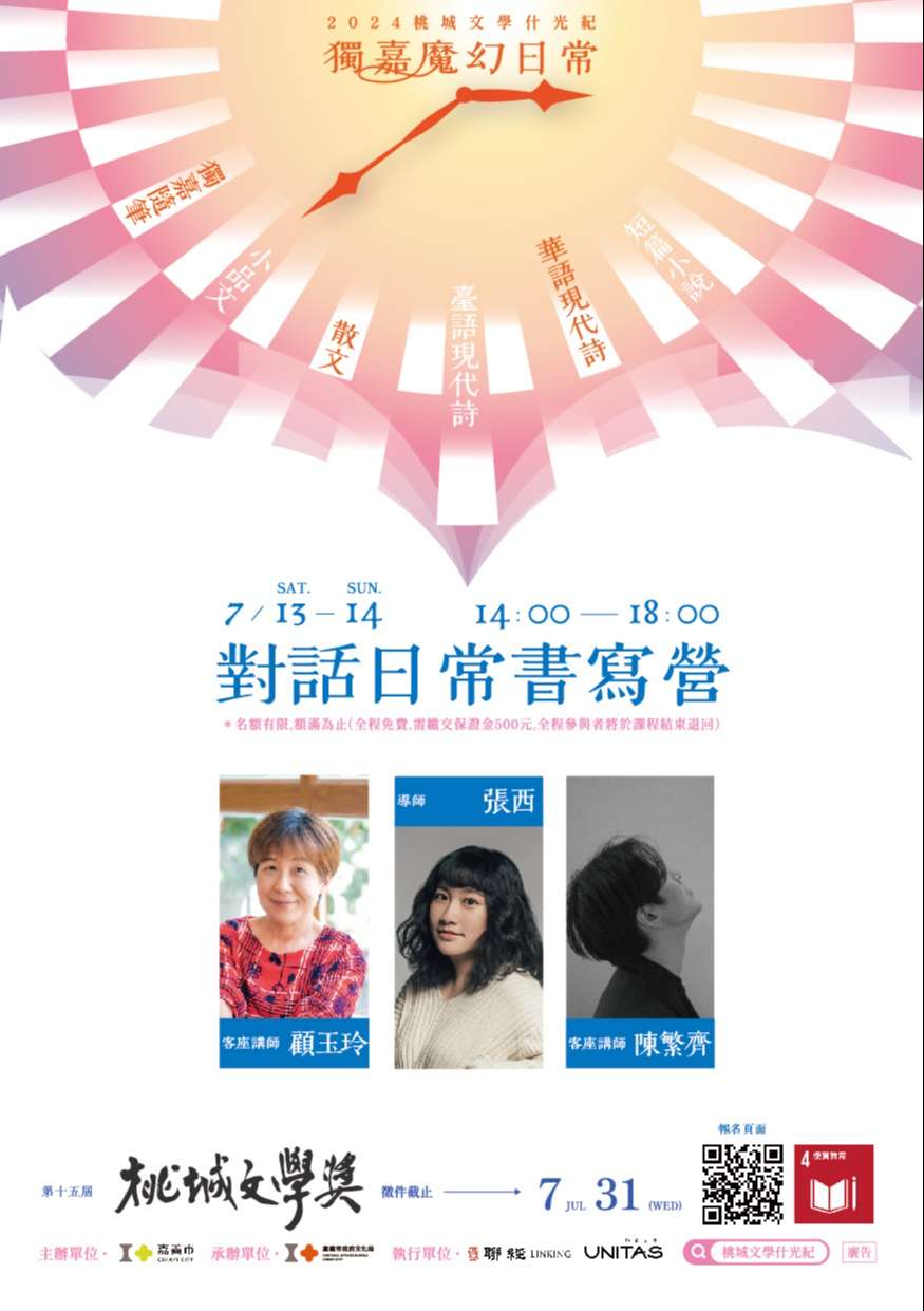 二、本局並於7月辦理1場文學獎推廣活動──「對話日常書寫營」,採線上填寫google表單報名,洽詢電話02-86925588轉5374陳小姐。