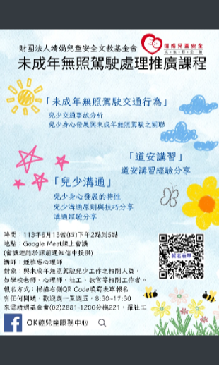 三、有鑒於此,該會期待透過辦理未成年無照駕駛處理推廣課 程,藉由邀請心理師分享於道安講習中與未成年無照駕駛家庭上課的經驗,讓相關工作者透過本次課程交流,一同了解如何與少年談未成年無照駕駛,同時使未成年無照駕駛再犯的可能性降低。