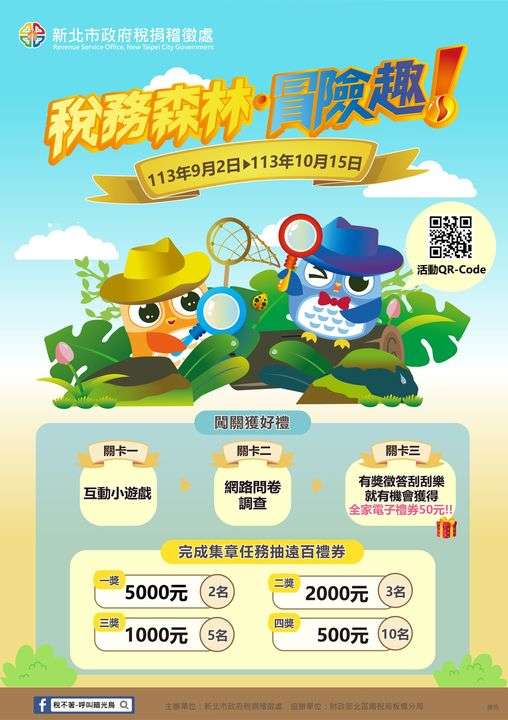 二、活動詳情請上「稅不著—呼叫暗光鳥」粉絲專頁 (https://www.facebook.com/ntpctax/)或活動網站 (https://feversocial.com/p/31316)查詢。