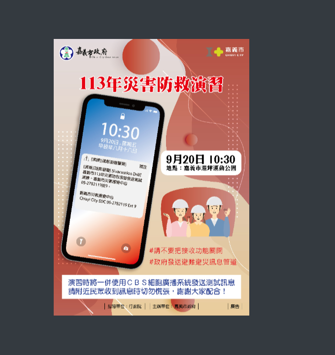 轉知嘉義市政府消防局訂於113年9月20日辦理113年災害防救演習, 結合發送「災防告警細胞廣播服務訊息演練」。