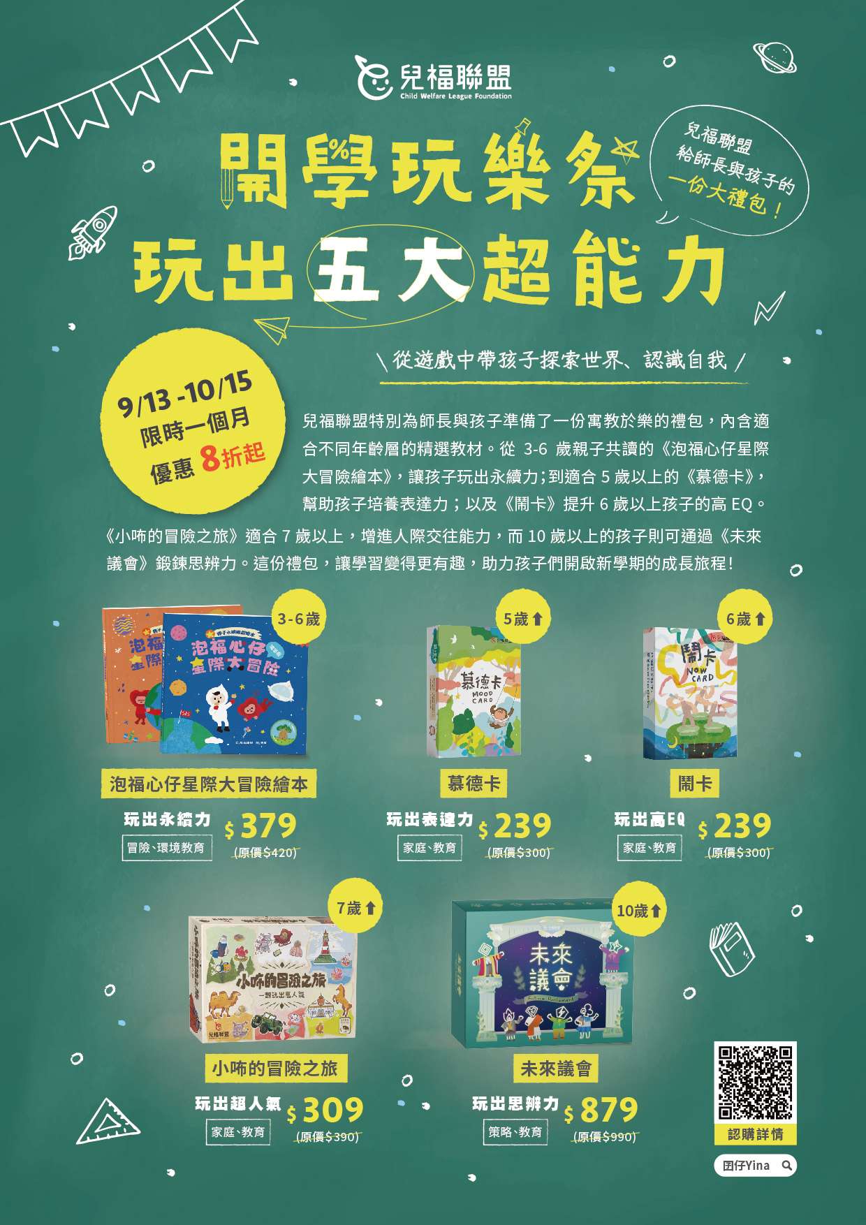 六、兒福聯盟為了不同年齡層孩子,精選適合的教材,讓孩子們玩出五大超能力,即日起至10月15日優惠8折起,詳情請參考附件海報說明。