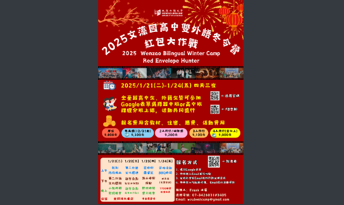 五、詳情可至本校推廣部網頁查詢:https://dee.wzu.edu.tw /Course/2987,或洽專線(07)3458212。