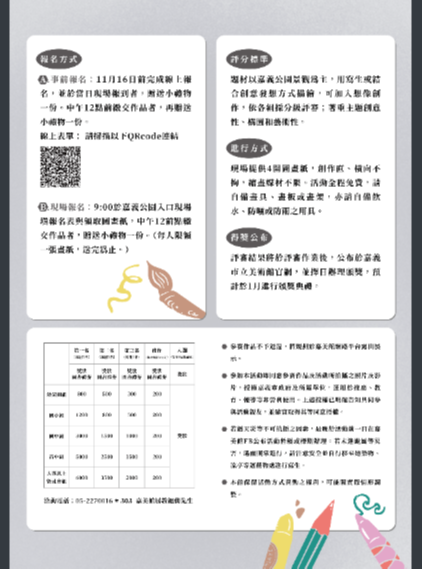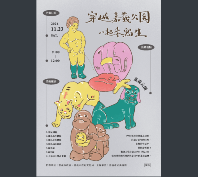 二、旨揭活動題材以嘉義公園景觀為主,用寫生或結合創意發 想方式描繪,可加入對嘉義公園想像,依各組採分級評 審;著重主題創意性、構圖和藝術性。