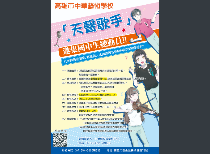 三、本案聯絡人:中華藝校音樂科(電話:07-5549696分機 235)。