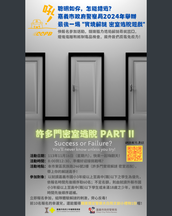 為增進少年從事有益身心發展之正向機會,減少沾染毒品危害之風險因子,嘉義市政府警察局舉辦以「實境解謎密室逃脫遊戲」為主題之少年犯罪預防宣導活動,相關訊息如下: