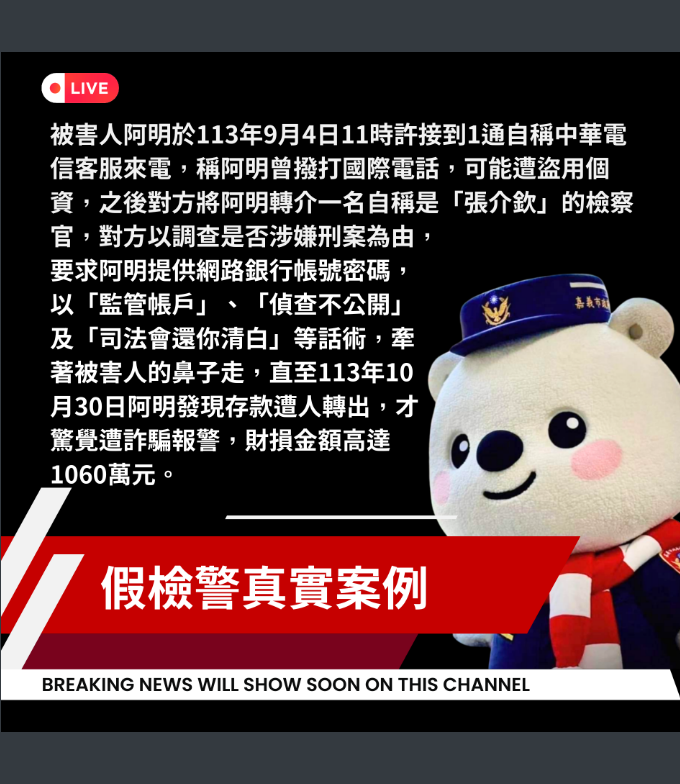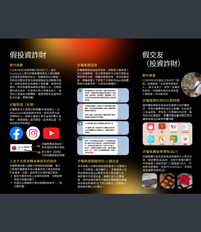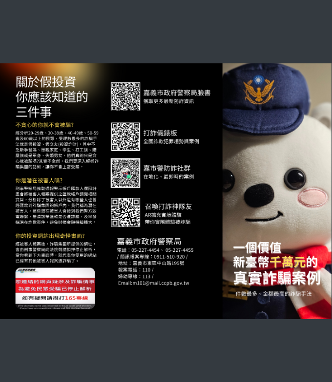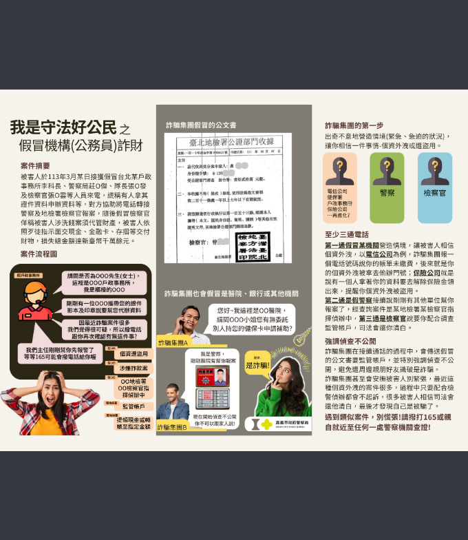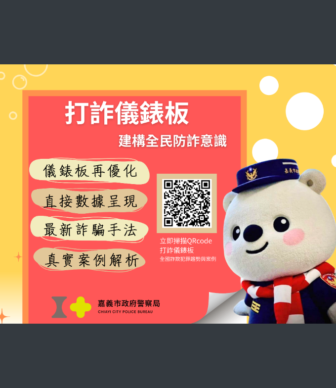 因應中央推動修訂打詐新四法,中央每日於「內政部警政署165全民防騙網」—公布「打詐儀錶板」民眾得即時瀏覽各地方詐騙危害狀況,希望透由全民重視詐欺案件,提升民眾防詐知能;另本府警察局以本市受理「真實詐騙案例」為題材製作相關防詐、識詐圖文並彙整識詐短影音如附件。