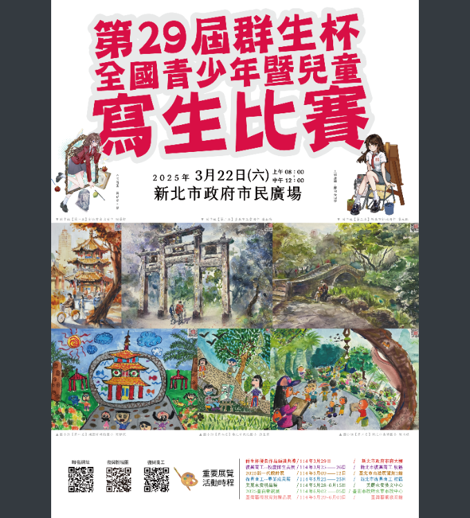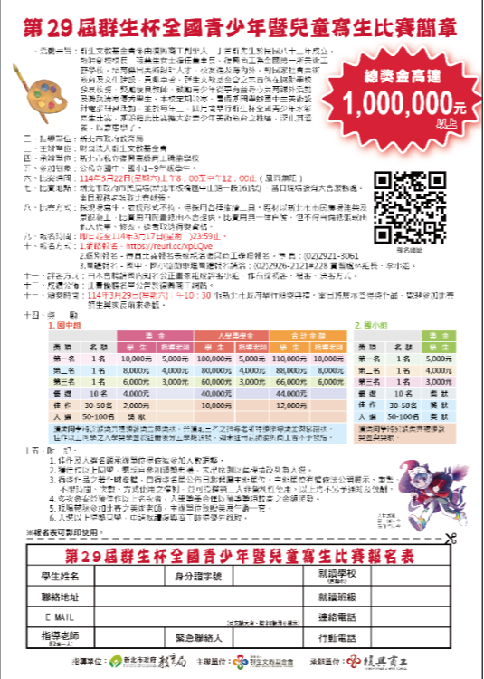 五、線上報名網址: https://reurl.cc/xpLQve (即日起至114年3月17日(一)23:59止)六、比賽簡章公告於 群生基金會網站首頁 http://ischool.fhvs.ntpc.edu.tw /ischool/publish_page/193/,敬請下載查閱。