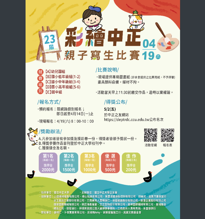 一、為促進社會大眾對高等學府教育環境的認識,藉由舉辦學 童親子寫生比賽活動,感受中正大學校園之美,發揮個人 創意,形塑中正大學形象,落實該會與中正大學共同推動 社區服務之理念,建構學校、社區及社會三方協力,共同 營造聯合國永續發展目標(SDGs)的未來學園。