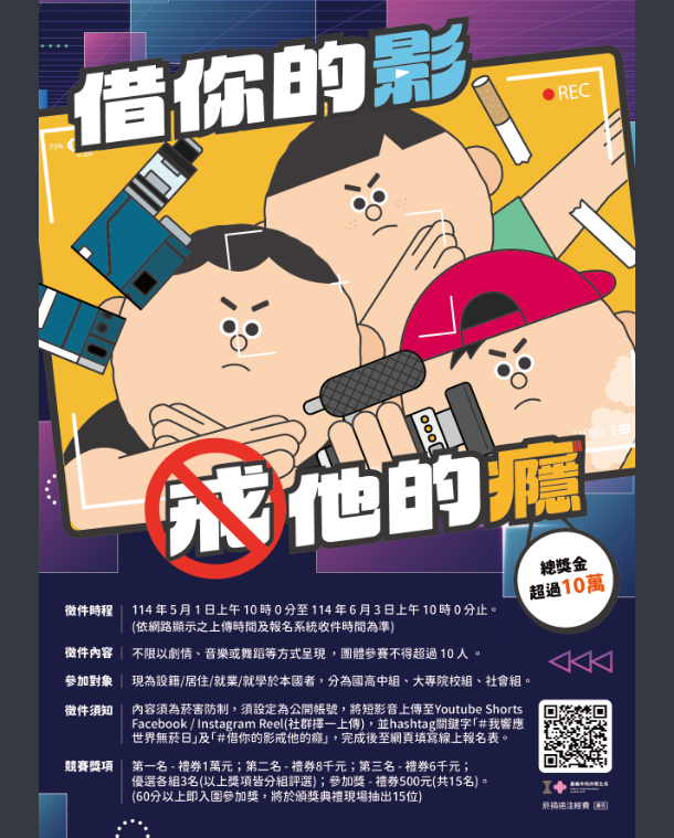 (四)參賽辦法:主題須為菸害防制,內容不限以劇情、音樂 或舞蹈等方式呈現,並將影片上傳至YouTube Shorts /Facebook Reels/Instagram Reels(不含限時動態),設 定為公開帳號,及hashtag關鍵字「#我響應世界無菸日」及「#借你的影戒他的癮」,完成後於網頁填寫報名 資訊。