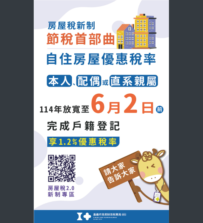 為加強宣導房屋稅新制自住優惠稅率設戶籍及申報期限放 寬至6月2日前。