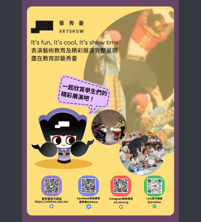 三、「藝秀臺」將持續提供優質展演及表演藝術教育推廣內 容,更多精采影片,請至「藝秀臺」網站,或至「藝秀 臺」臉書粉絲專頁:臉書搜尋「藝秀臺ArtShow」、官方 IG:搜尋「art.show.ig」關注即時訊息。