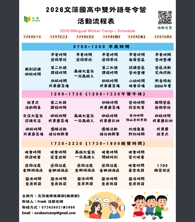 一、時間:民國115年1月26日(一)至1月31日(六),共6天5夜。