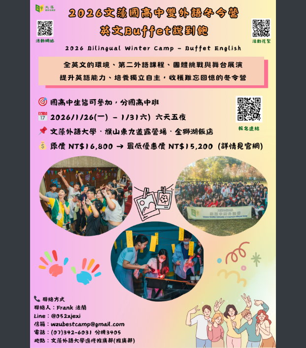 五、詳情可至本校進修推廣部網頁查詢:https://dee.wzu.edu.tw/Course/3900,或洽專線(07)3458212。
