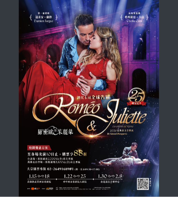 一、經典法文音樂劇《羅密歐與茱麗葉》自2001年在巴黎首演即轟動全球,以磅礴動人的音樂、現代感十足的編舞與都市巴洛克風格美學,重新詮釋莎士比亞經典悲劇,劇中更以紅與藍兩大色系象徵家族對峙,展現強烈視覺張力;而初代卡司的演出早已成為大眾心中難以取代的記憶,本次適逢音樂劇25周年同時也是初代卡司告別巡演,讓這次在台灣的演出更具紀念性。法文音樂劇以獨樹一格的「演唱會」形式製作打造,特別強調「音樂」與「演員魅力」,以「歌」帶「戲」是法式音樂劇製作的順序與模式,藉由歌曲詠唱以及雋永詞彙的表達,再加上多樣化背景音樂襯托,讓演員的情緒起伏及情感傳遞更加深刻。