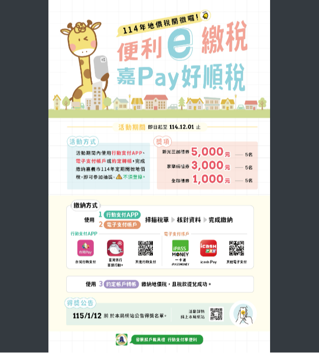 (三)「便利e繳稅 嘉Pay好順稅」,於12月1日前以行動支付、電子支付或約定轉帳方式繳納本市開徵地價稅即可參加抽獎。