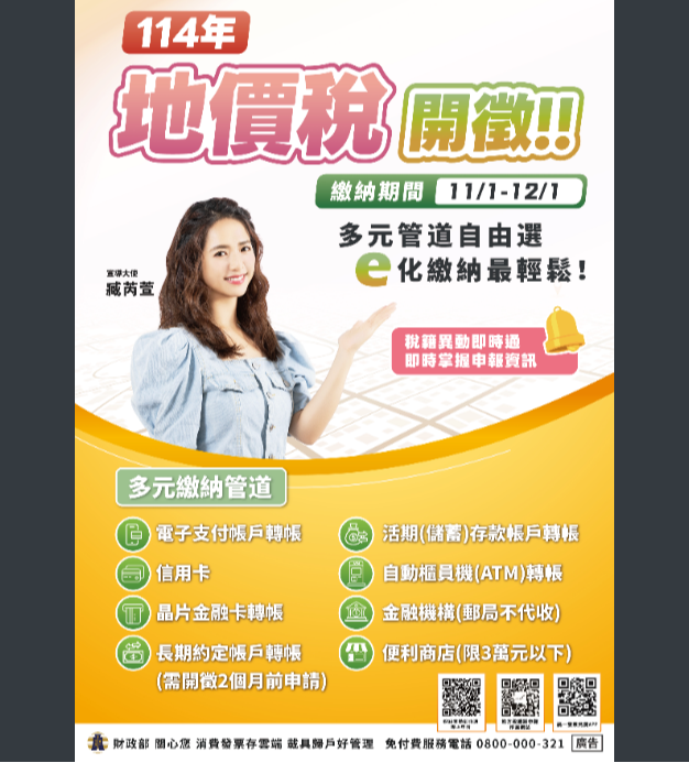 (一)114年地價稅於11月1日開徵,繳納期限至11月30日(適逢假日順延至12月1日)止。