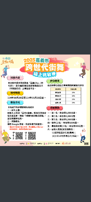 (一)挑戰內容:依本局提供限定歌曲「嘉義City」(約45 秒),自行編排舞蹈並錄製影片上傳至指定平台。